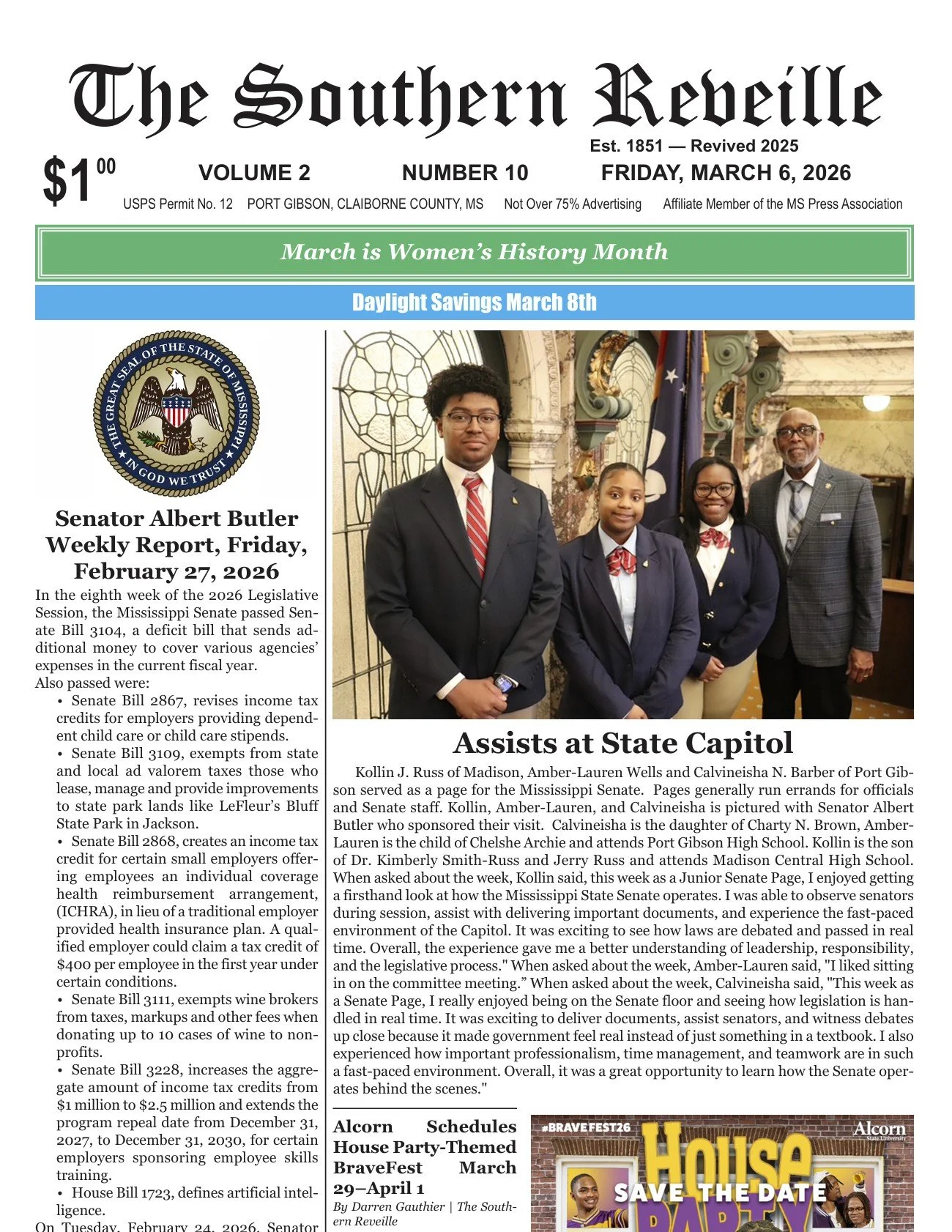 Receive weekly physical copies of The Southern Reveille - Port Gibson. Billed $2/weekly.