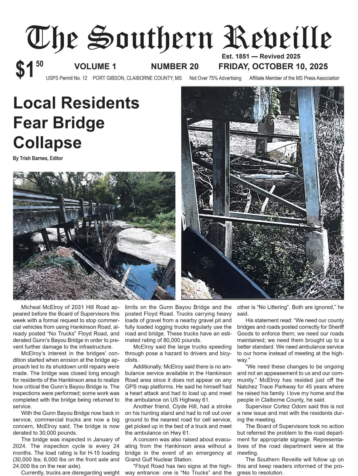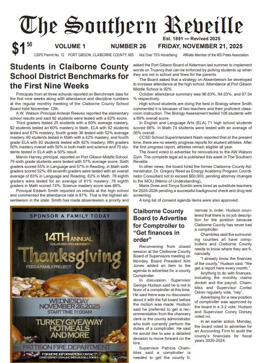 The Southern Reveille picks up where The Port Gibson Reveille left off, bringing you weekly Claiborne County stories and news updates.